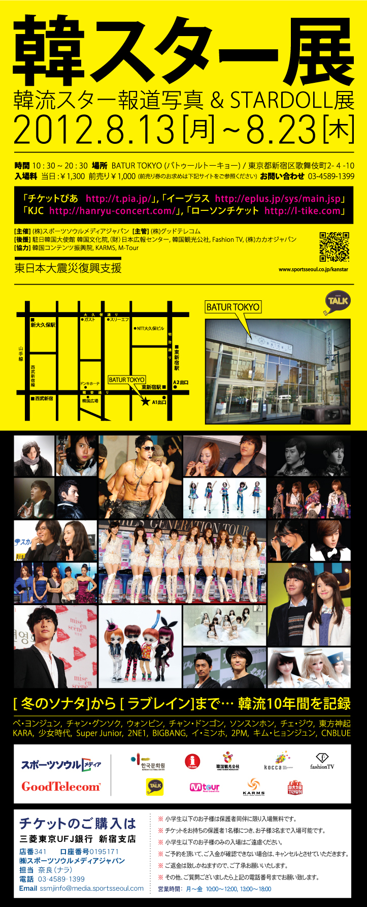 そして「東方神起」、「KARA」、「少女時代」、「2PM」、「BIGBANG」などのK-POPスター人形「Atti Doll/アティドール」が日本初上陸。8月13日~23日 期間限定で新大久保「BATUR tokyo(バトゥール東京)」にてこの夏 開催。収入の一部は(財)日本広報センターを通して東日本大震災復興支援義援金として寄付される。」