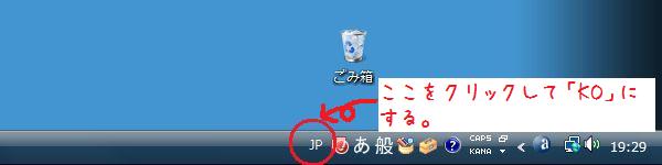 入力するときは、PCの一番下のバーにある「JP」をクリックして「KO」に変えます。