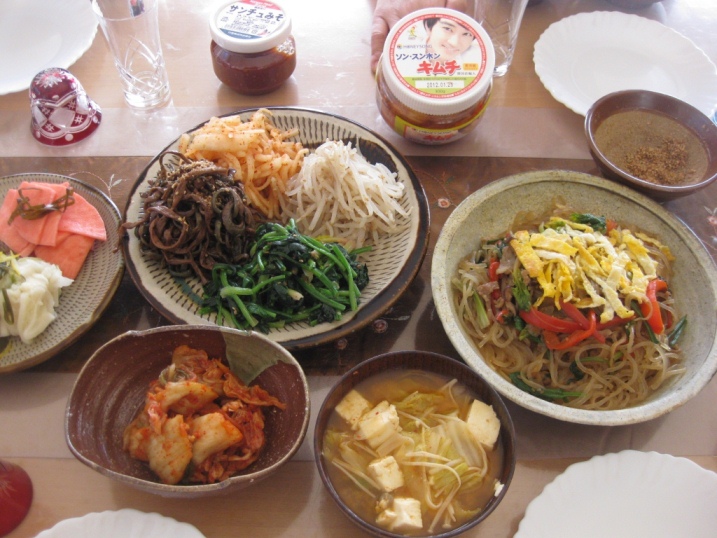 チャプチェとナムル各種、スンドゥブチゲ風椀物、お漬物、それに忘れちゃいけないスンホンキムチ!