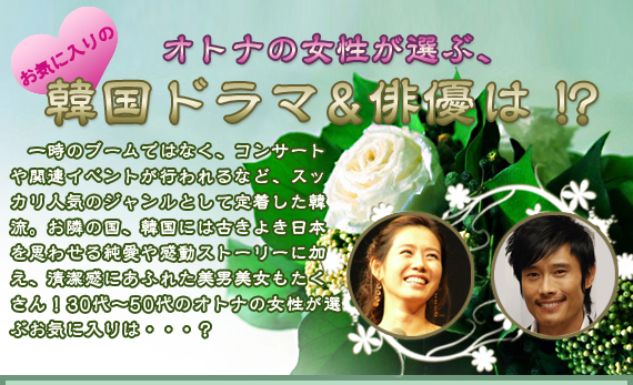 第1位はやっぱり『冬のソナタ』。「ありえない設定、昔の少女マンガ的なところがおもしろいから」(北海道/50代)、「セリフ、映像、役者、音楽、全てきれい」(鳥取県/50代)という内容はモチロンだが、「韓国ドラマの火付け役ともいうべきドラマで衝撃的だった」(東京都/40代)というタイミングも大きかったようだ。それとは逆の理由で2位になったのが『宮廷女官チャングムの誓い』。「お定まりの韓流恋愛ドラマとは違って、内容が深くて面白かった」(大阪府/40代)、「韓国の歴史がわかったし、料理もとても美味しそうだった。女優・俳優もとても魅力的だった」(兵庫県/30代)と、純愛ドラマから一歩進んだ上級者たちや韓流ファン以外からも高い評価を得た。3位の『天国の階段』は、「ジェットコースター並みの内容と、これでクォン・サンウを知りファンになった」(神奈川県/40代)や5位『夏の香り』の「ソン・スンホンがカッコよかった」(千葉県/30代)という意見に見られるように、お気に入りのスターを発見するのも韓国ドラマの大きな楽しみのひとつ。現在放映中の『春のワルツ』も「これからどうなっていくのか楽しみ」(愛知県/50代)と、4位にランクイン。これで「ストーリー、キャスト、音楽の全てが良い」(神奈川/50代)というユン・ソクホ監督の四季シリーズは、1位、4位、5位そして9位の『秋の童話』と、すべての作品がトップ10入り。また、地上波で放映された作品に人気が集まる傾向が強かった。