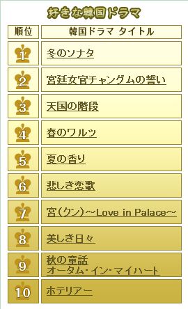 思うに、これがごくごく一般の日本人の韓流に対する認識からくるランキングではないでしょうか。